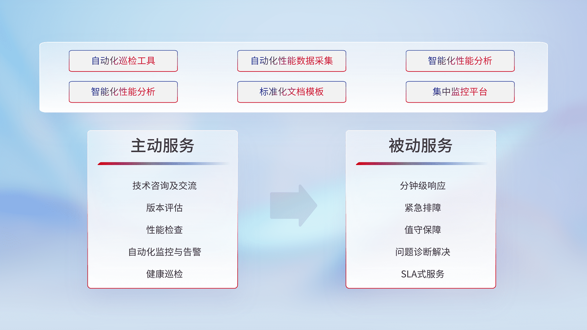 智能化工具和标准化文档,,,保障服务质量,,,,提供主动服务(包含技术咨询、、、版本评估、、、性能检查、、、自动化监控与告警、、、健康巡检)和被动服务包含(分钟级响应、、、、紧急排障、、、值守保障、、问题诊断解决、、SLA服务)。。。。