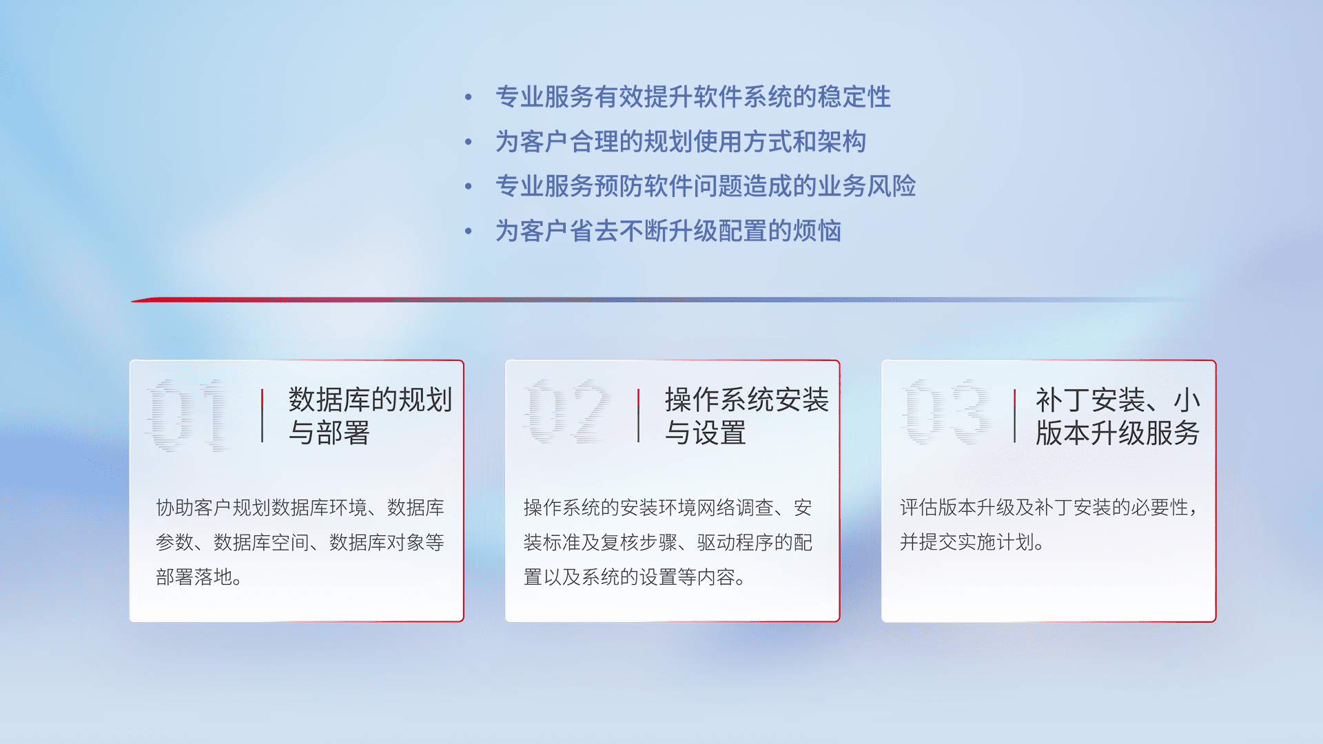 为客户提供软件规模升级、、快速部署、、、、按需配置的专业服务,,,,从数据库的规划与部署到操作系统的安装与设置,,,再到补丁安装和小版本升级提供支持。。。