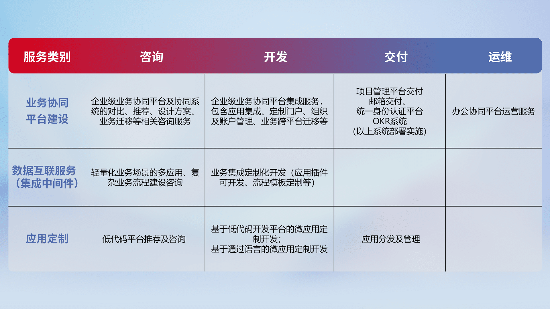 针对钉钉、、、企微、、、IDaas等平台级产品提供产品的规划、、、方案、、交付、、定制化开发等服务,,实现如统一协同办公、、智能客户服务、、、混合会议管理、、、智能数据查询、、、、等业务场景,,,,实现数字化转型。。。